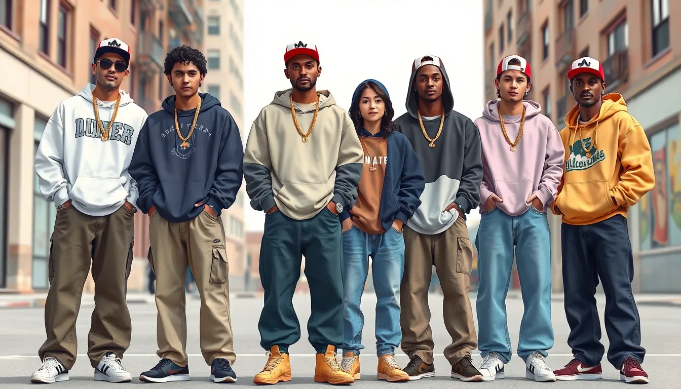 Baggy clothing dominated this period, providing comfort and a relaxed aesthetic. Baggy jeans became a staple for both men and women, often worn several sizes larger than the wearer’s actual size. Loose-fitting tees with bold graphics complemented this silhouette. Streetwear often included oversized hoodies, popular for their casual vibe. Many artists embraced this style, solidifying its significance in hip hop culture, which emphasized individuality and self-expression.